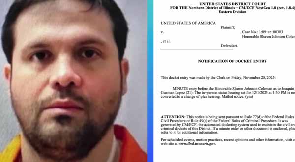 De acuerdo con una minuta de la Corte de Distrito para el Norte de Illinois, en Chicago, la audiencia para este 1 de diciembre, a las 13:30 horas, será una comparecencia para cambio de declaratoria para Guzmán López, quien enfrenta cinco cargos por narcotráfico, crimen organizado y posesión de armas de fuego.