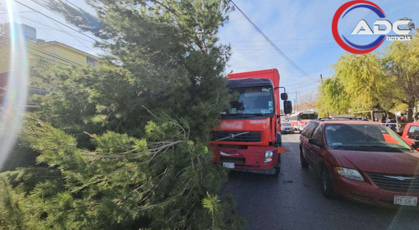 Chihuahua, Chih.-Un camión repartidor de refrescos protagonizó un accidente en la intersección de las calles Francisco de Saucedo y Anacleto de Canaval, en la colonia El Marmól, luego de que un pino cayera sobre un vehículo estacionado.
