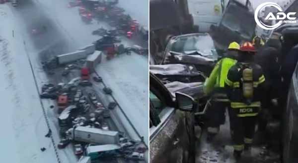 Estados Unidos.- A través de las redes sociales, se dio a conocer un impresionante video en el que se puede ver cómo una tormenta invernal en Estados Unidos causó que aproximadamente 50 vehículos de diferentes tamaños se vieran involucrados en un choque.