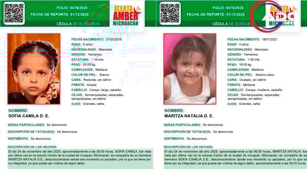 Según la información difundida en dichas fichas, las menores fueron vistas por última vez junto a su madre la mañana del lunes 24 de noviembre en la colonia Centro de Uruapan, alrededor de las 9:30 horas. Desde ese momento no existe rastro que permita conocer dónde se encuentran.