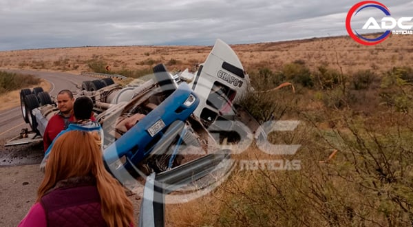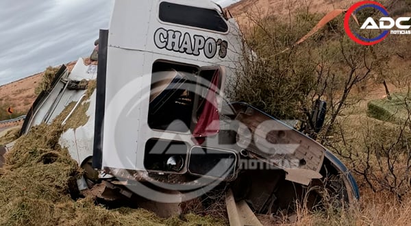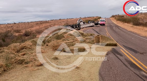 Cd. Delicias, Chih.- Un tráiler cargado con pacas de alfalfa volcó la tarde de hoy en la carretera Delicias–Satevó, a la altura del kilómetro 12, provocando fuertes daños materiales y la movilización de cuerpos de emergencia.