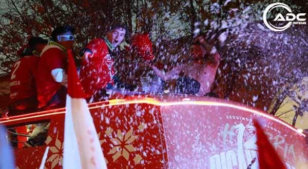 Toluca.- Un campeonato se celebra, dos consecutivos se vuelven un carnaval. Como si no hubiera sido suficiente la algarabía de la madrugada de este lunes para festejar el título 12 de los Diablos Rojos, la afición escarlata otra vez tomó las calles de la ciudad de Toluca para vitorear a sus bicampeones, para cantar, brincar y bailar con ellos este nuevo trofeo de liga que pone a la institución como la segunda más ganadora del futbol mexicano.