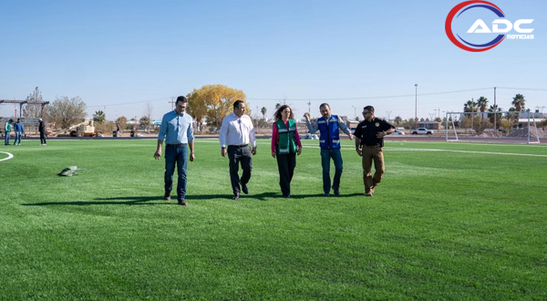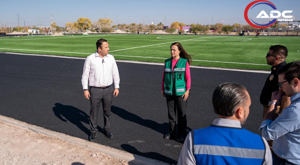 Cd. Delicias, Chih.- Avanzan de manera significativa los trabajos en la construcción de la nueva pista de atletismo, donde ya se concluyó la instalación de la cancha de fútbol, las porterías y la capa base del material de tartán, lo que marca una etapa importante en el desarrollo de este proyecto deportivo, supervisión realizada por el presidente municipal Jesús Valenciano García.