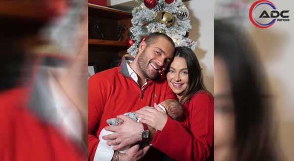 Claudia y Carlos posaron al lado de su árbol de Navidad con su hijo Máximo en brazos, se les vio sonrientes y felices por el nuevo integrante de la familia.