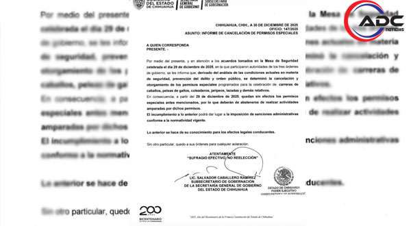 Chihuahua, Chih.- El Gobierno del Estado de Chihuahua canceló los permisos especiales para la realización de carreras de caballos, peleas de gallos, coleaderos, jaripeos, lazadas y eventos similares, luego de un análisis de las condiciones actuales en materia de seguridad, prevención del delito y orden público en la entidad.