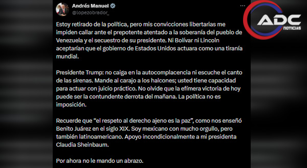 Ciudad de México.- El ex presidente Andrés Manuel López Obrador condenó la intervención militar de Estados Unidos en Venezuela —calificándola como un atentado contra la soberanía del pueblo— y el "secuestro" del presidente Nicolás Maduro.En un mensaje publicado a través de sus redes sociales, el ex mandatario señaló que a pesar de su retiro de la vida política, sus convicciones le impiden guardar silencio ante este tipo de acciones.