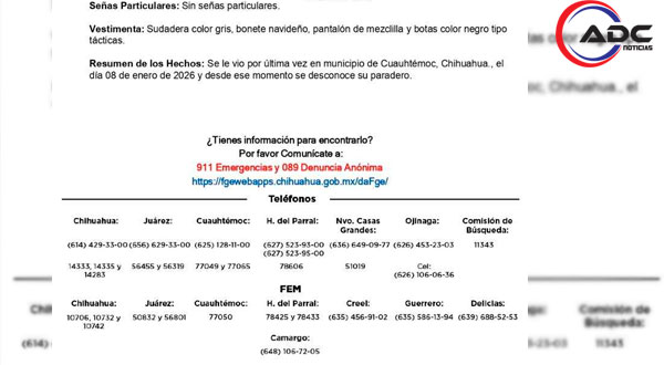 Cuauhtémoc, Chih.-Las autoridades piden la colaboración de la ciudadanía para localizar a Miguel Bustillos Castillo, un niño de 11 años que fue reportado como desaparecido el 8 de enero en el municipio de Cuauhtémoc.