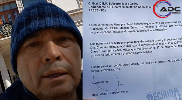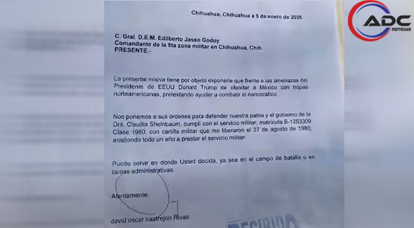El documento, cuya copia también fue difundida en redes sociales, establece su intención de colaborar en la defensa del país y del gobierno federal encabezado por la presidenta Claudia Sheinbaum. La recepción del oficio quedó asentada en video y fotografías tomadas en las instalaciones de la Quinta Zona Militar.