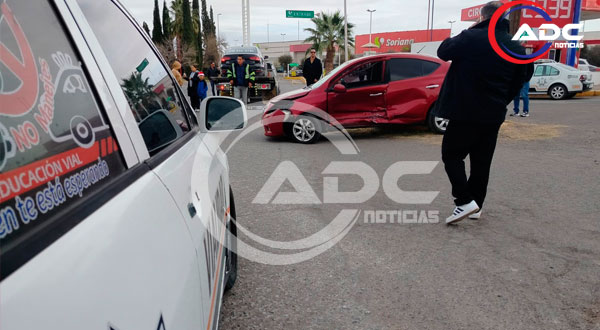 Cd. Delicias, Chih.- Un aparatoso accidente vial tipo choque se registró la tarde de este día en el cruce del bulevar Gómez Morín con la avenida Quinta y la calle Novena Oriente, frente a Soriana Híper, lo que generó expectación entre automovilistas y peatones que transitaban por la zona.