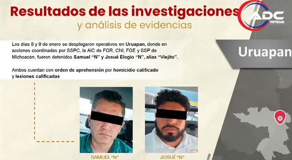 Ambos detenidos fueron puestos a disposición de la Fiscalía General del Estado (FGE) de Michoacán bajo órdenes de aprehensión por homicidio calificado y lesiones calificadas. Entre el 8 y 9 de enero se desplegaron operativos coordinados en Uruapan para dar con ellos.