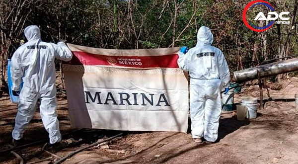 En Sinaloa, en el poblado Los Cedros, se desmanteló un laboratorio donde se aseguraron alrededor de 750 kilos de producto terminado, así como mil 150 litros y 695 kilos de precursores químicos.
