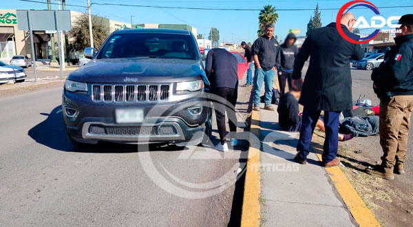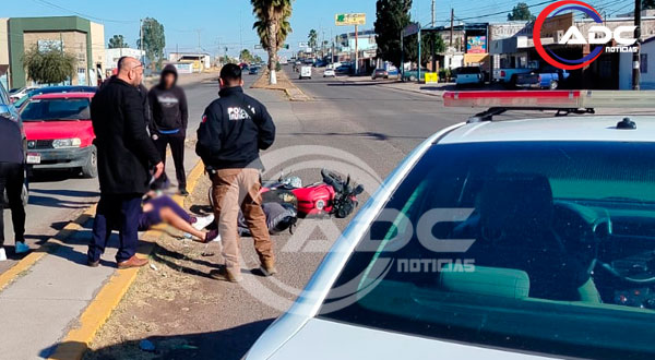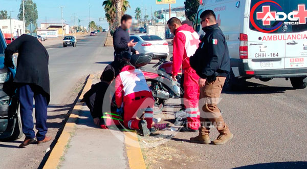 Cd. Delicias, Chih.- Un joven motociclista resultó lesionado luego de verse involucrado en un accidente vial registrado cuando circulaba en sentido de oriente a poniente sobre la avenida Calzada del Charro, hecho que movilizó a voluntarios y cuerpos de auxilio en el sector.