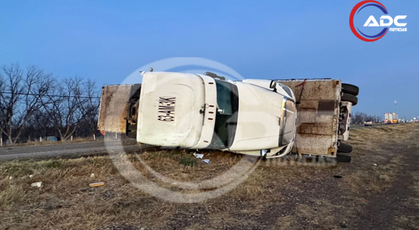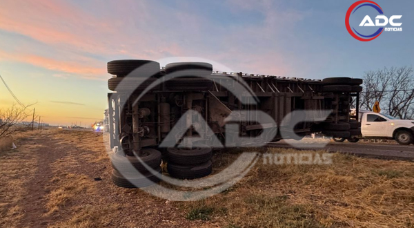 Camargo, Chih.- Un aparatoso accidente se registró en el kilómetro 63 de la carretera Camargo–Jiménez, en el tramo de cuota y con circulación de sur a norte, luego de que una de las plataformas de un tráiler de doble remolque se desprendiera y terminara volcada, generando afectaciones a la vialidad.