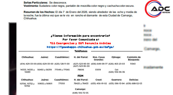 Según los informes, fue visto por última vez el 7 de enero alrededor de las 20:30 horas en el rancho “El Diamante”.