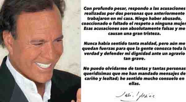 México.- El cantante Julio Iglesias respondió por las acusaciones de dos empleadas que aseguran haber sido víctimas de abuso, aseguró que él no hizo nada en contra de ninguna mujer.