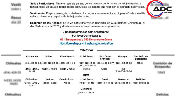 Cuauhtémoc, Chih.- Autoridades piden la colaboración de la ciudadanía para localizar a Juan Luis Irigoyen Gobernador, de 26 años, reportado como desaparecido desde el 20 de enero en Cuauhtémoc.