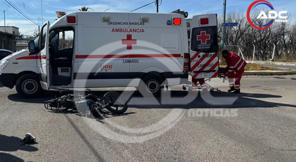 Camargo, Chih.- Dos jóvenes que viajaban en una motocicleta resultaron lesionados luego de un accidente vial registrado en el cruce de las calles Guillermo Prieto y Francisco Villa, en la ciudad de Camargo, lo que provocó la movilización de cuerpos de emergencia y autoridades de tránsito.