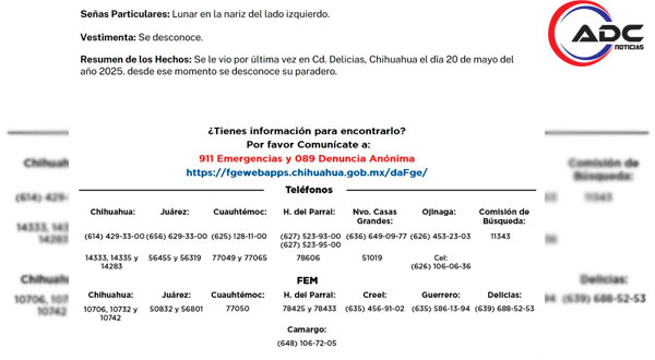 La Fiscalía exhorta a cualquier persona que cuente con información que ayude a dar con su ubicación a comunicarse al 911, al 089 para denuncia anónima, o a través del portal oficial de la Fiscalía General del Estado de Chihuahua.