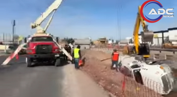 Chihuahua, Chih.-Una pipa de agua volcó al interior de la zona de construcción del puente vehicular ubicado en el cruce de las avenidas Los Nogales e Industrias, en sentido de oeste a este. El accidente ocurrió durante maniobras realizadas dentro del área de excavación de la obra.