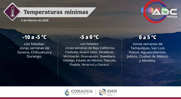 De acuerdo con el pronóstico de Conagua, los valores más bajos se esperan en regiones montañosas de Sonora, Chihuahua y Durango, mientras que otros estados como Coahuila, Nuevo León, Estado de México, Puebla y Veracruz podrían registrar temperaturas bajo cero. En entidades del centro y occidente, el termómetro oscilaría entre cero y cinco grados.