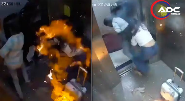 En el video se observa cómo una mujer detiene el ascensor para permitir el ingreso de un joven y de un hombre que empujaba un carrito con una bolsa de plástico que contenía varios globos. Apenas unos segundos después de que el hombre entra al elevador, los globos explotan repentinamente, generando una intensa llamarada que por un momento llena el interior del ascensor.