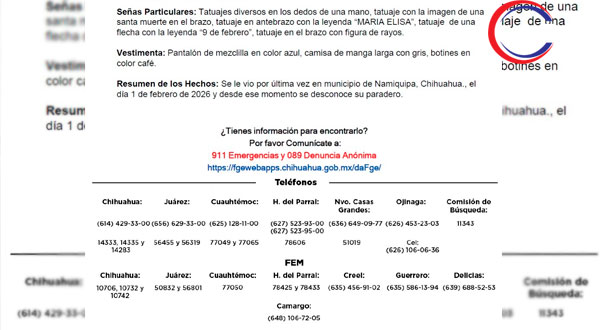 Casas Grandes, Chih.- La Fiscalía General del Estado de Chihuahua emitió una ficha de búsqueda para solicitar el apoyo de la ciudadanía en la localización de Alejandro Bailón Arana, quien se encuentra desaparecido desde el pasado 1 de febrero de 2026.