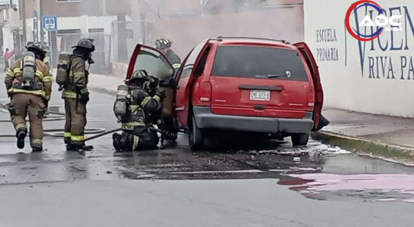 Chihuahua, Chih.- Una camioneta Dodge Caravan roja quedó parcialmente destruida por un incendio que se originó en el motor, luego de que el conductor detectara humo saliendo de la parte frontal del vehículo.