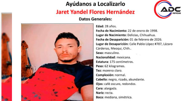 Meoqui, Chih.- Familiares de Jared Yandel Flores Hernández, de 28 años y originario de Lázaro Cárdenas, municipio de Meoqui, Chihuahua, solicitan el apoyo urgente de la ciudadanía para dar con su paradero. El joven desapareció el domingo 1 de febrero de 2026 tras salir de su domicilio, sin que hasta el momento se tenga información sobre su ubicación, lo que ha generado gran preocupación entre sus seres queridos.