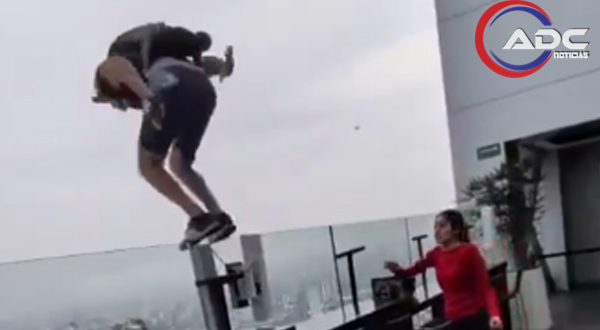 En las imágenes se observa al hombre subir a una mesa para calcular el salto, mientras una empleada le pide que descienda y advierte que llamará a seguridad. Segundos después, el joven se arroja al vacío. Otro video muestra el momento en que aterriza, recoge el paracaídas y aborda una camioneta que lo esperaba para retirarse del lugar.