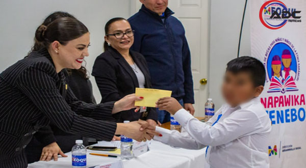 Meoqui, Chih.- La alcaldesa de Meoqui, Miriam Soto, realizó la entrega de becas del programa “Napawika Benevo, Aprendemos Juntos”, el cual beneficia a más de 40 niñas y niños de la Escuela Primaria Indígena del municipio, con el objetivo de fortalecer la educación y garantizar la igualdad de oportunidades.